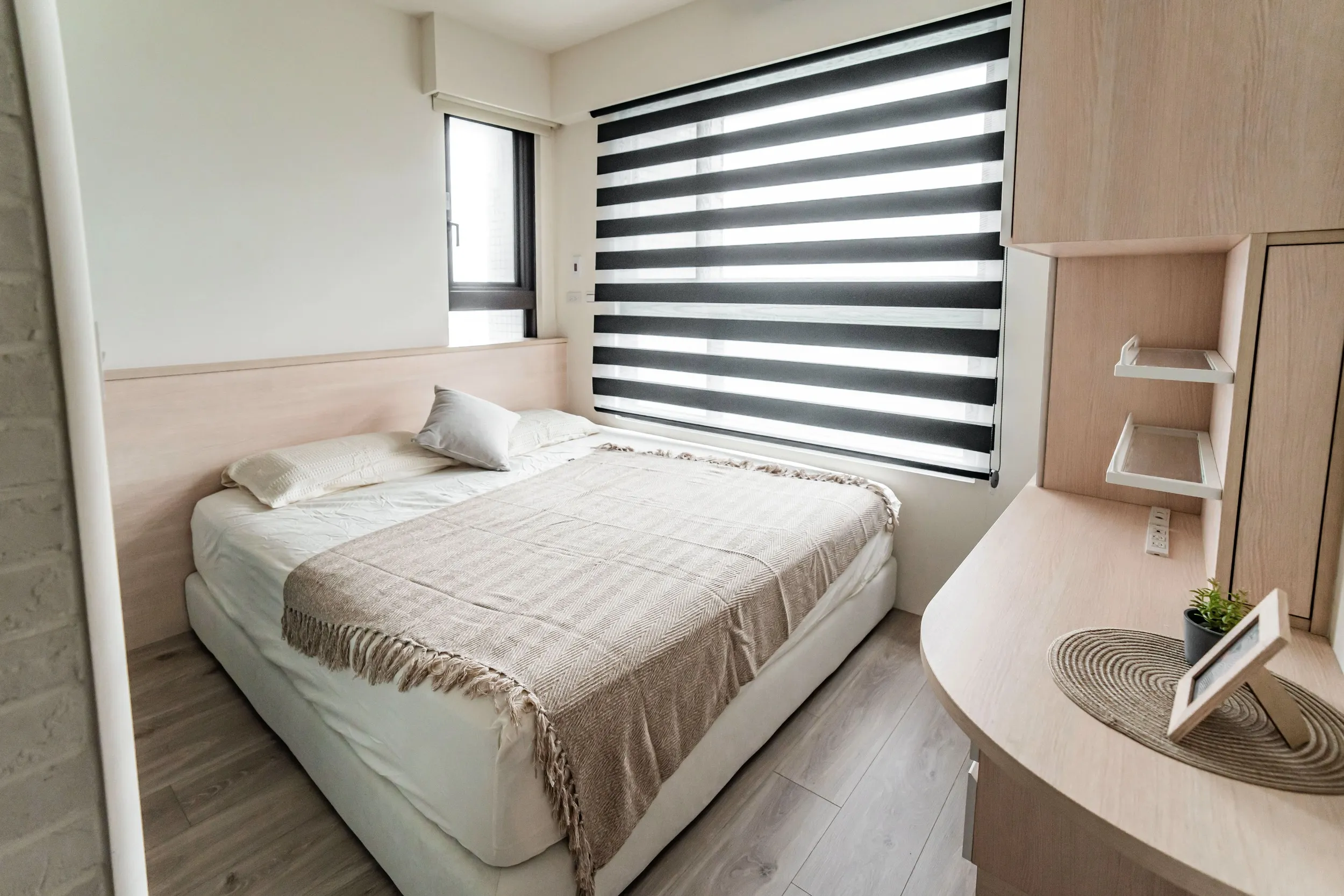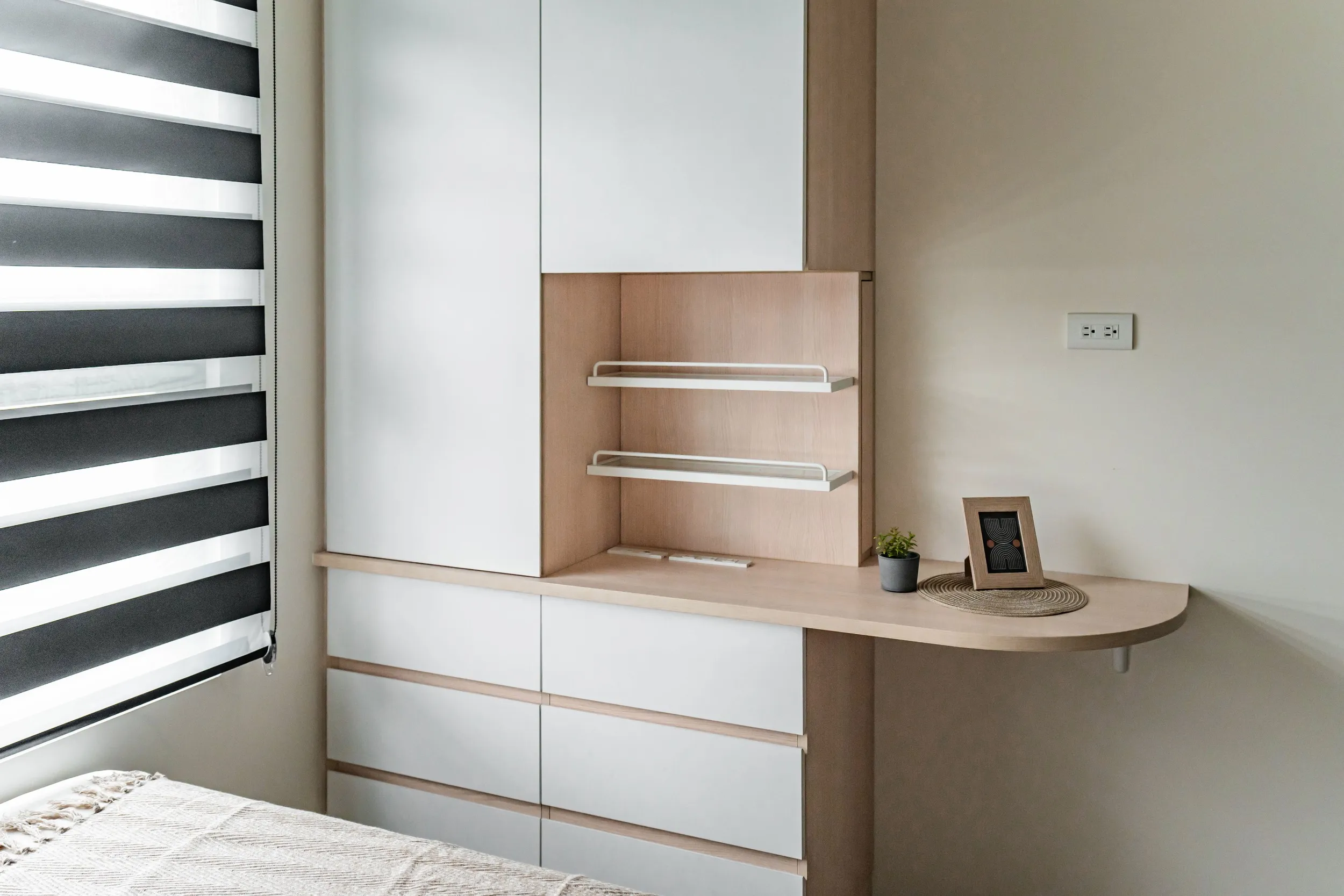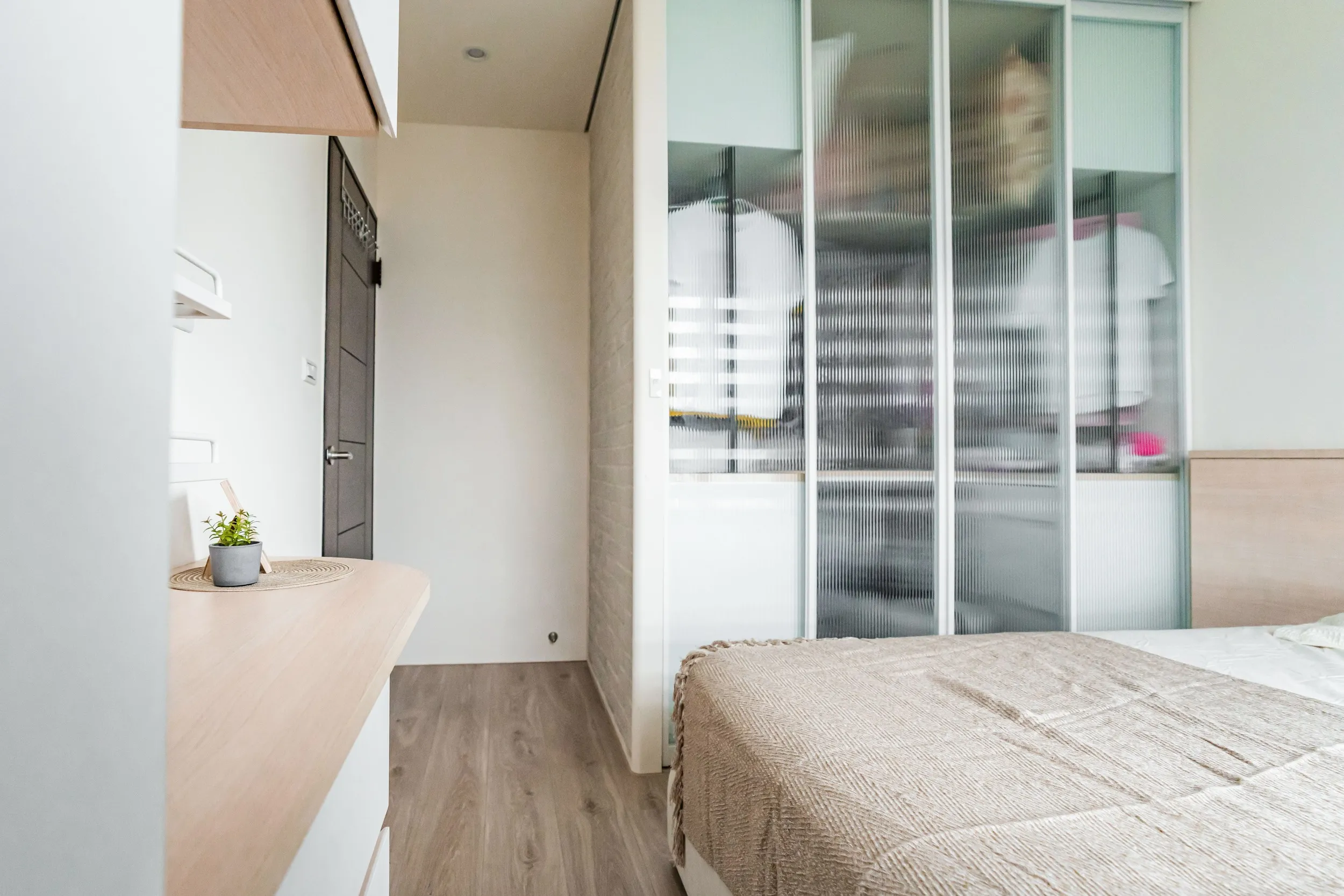 在小坪數的主臥室空間規劃了更衣室及女主人的化妝台區,充分發揮每一寸空間的效用,滿足生活的需求與品味。