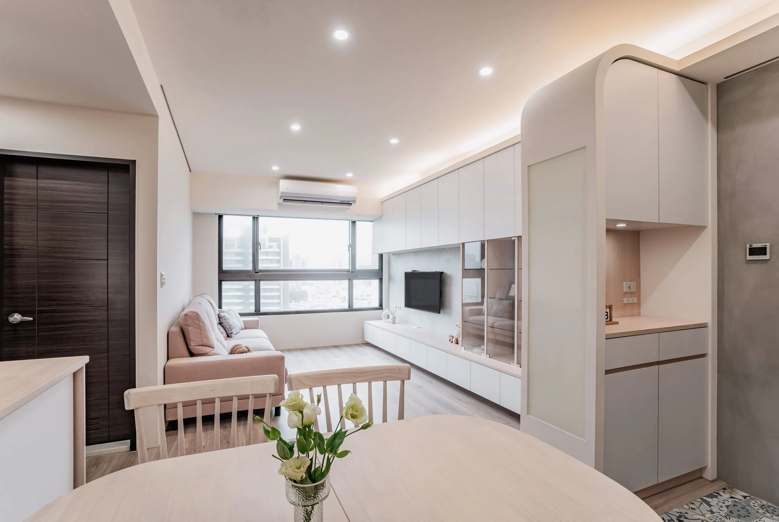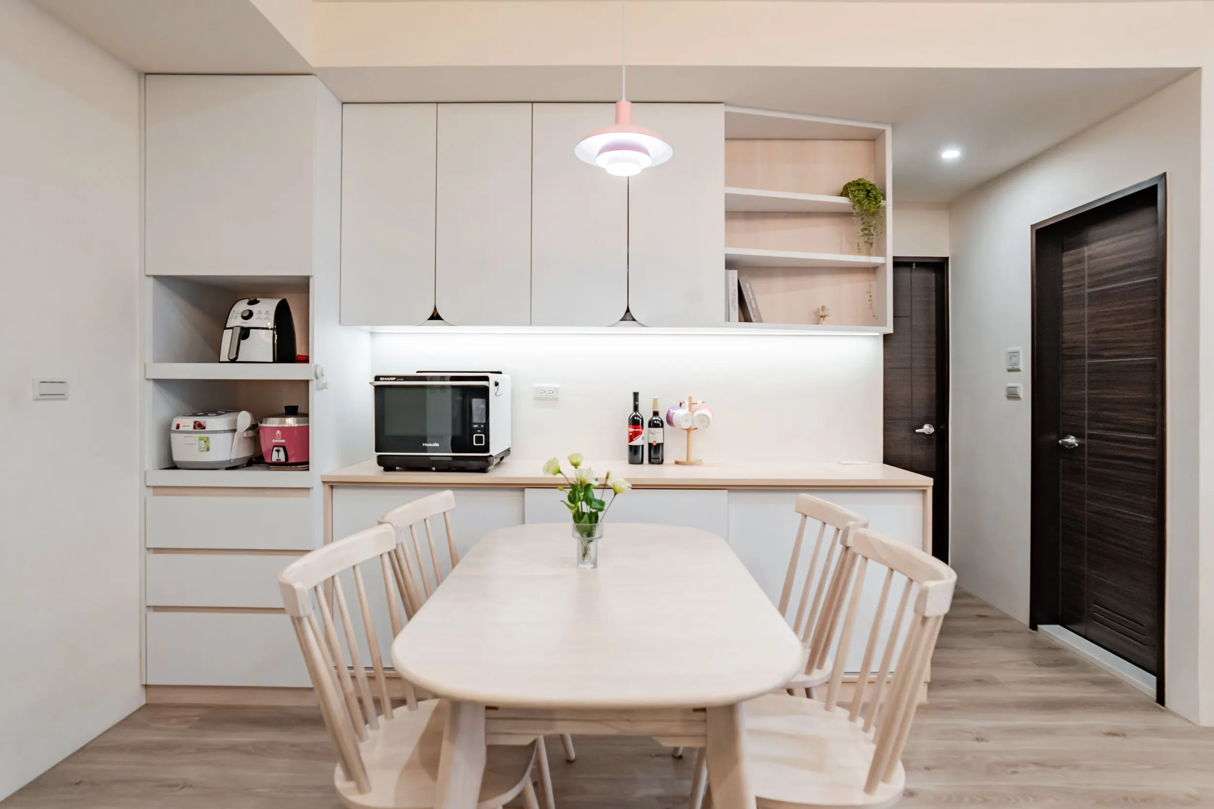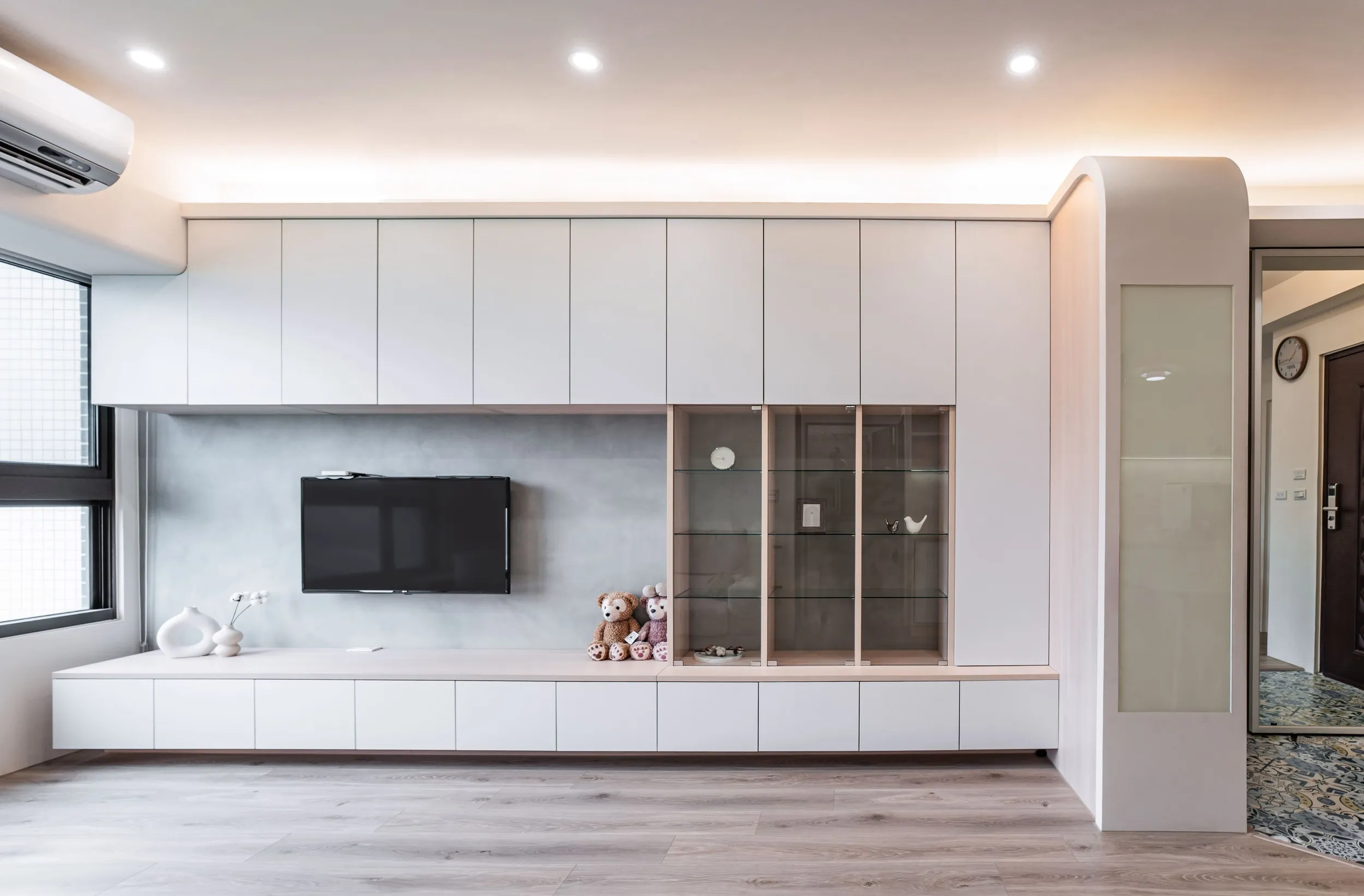 整體設計以純淨的白色與自然木色為主軸。公共空間的收納融合了木作可塑性與系統櫃模組化設計,實現了功能與美感的和諧一致。