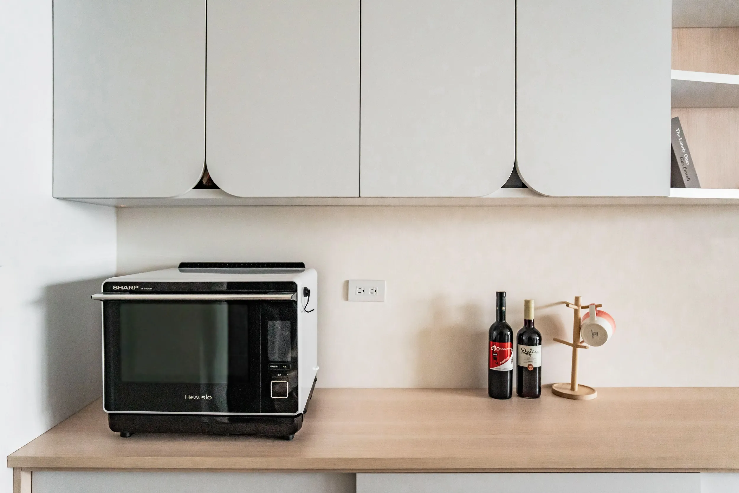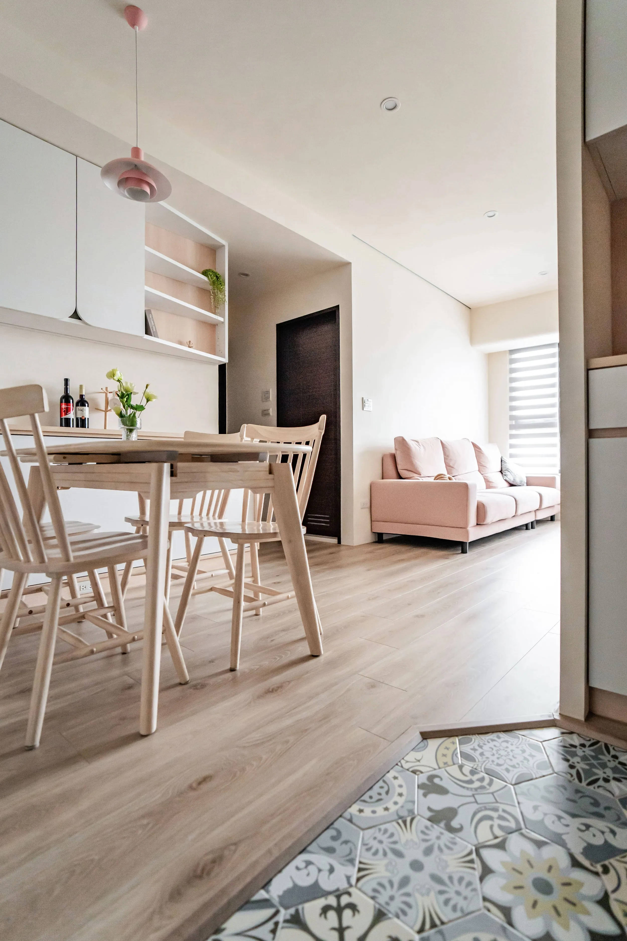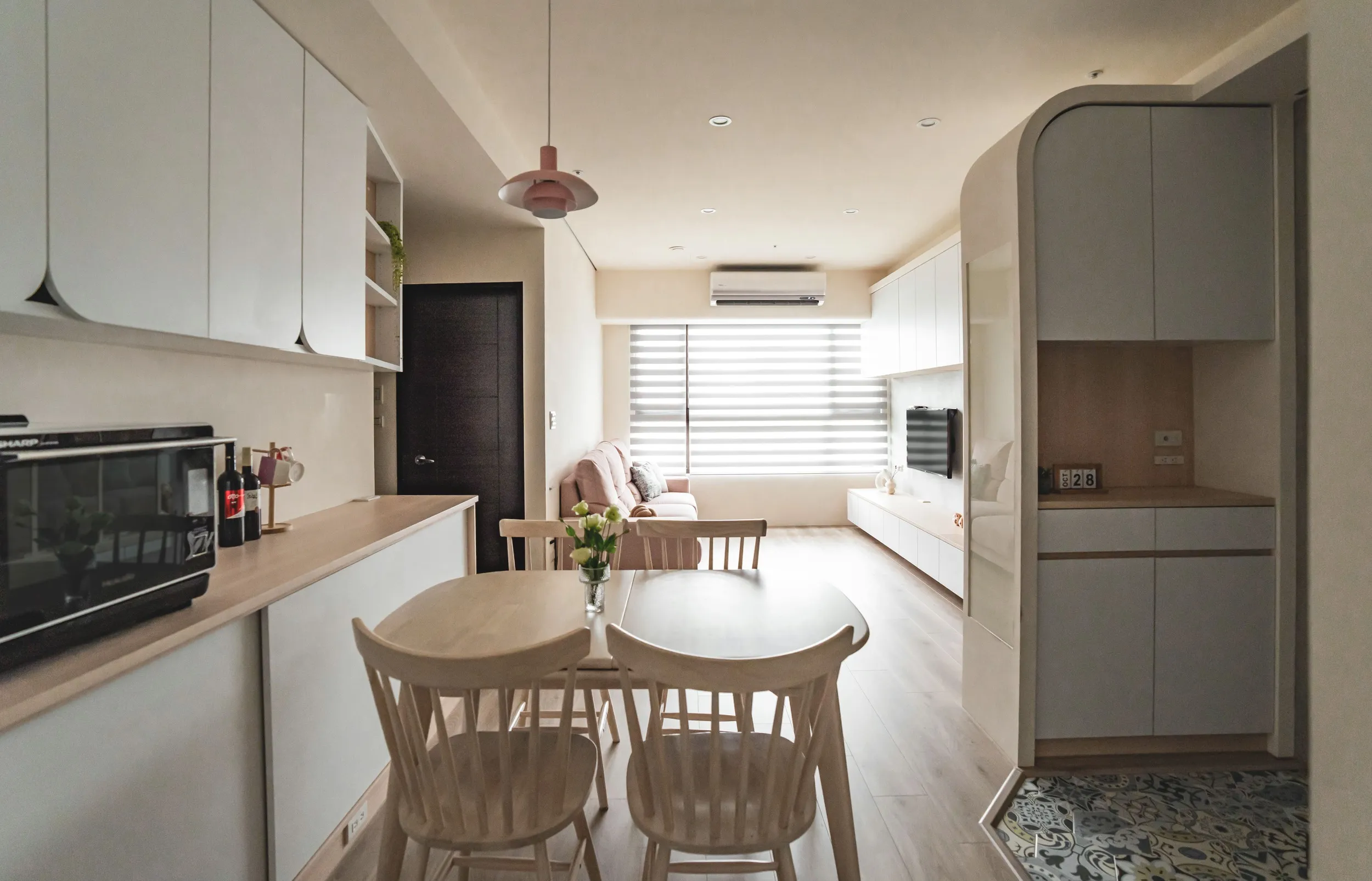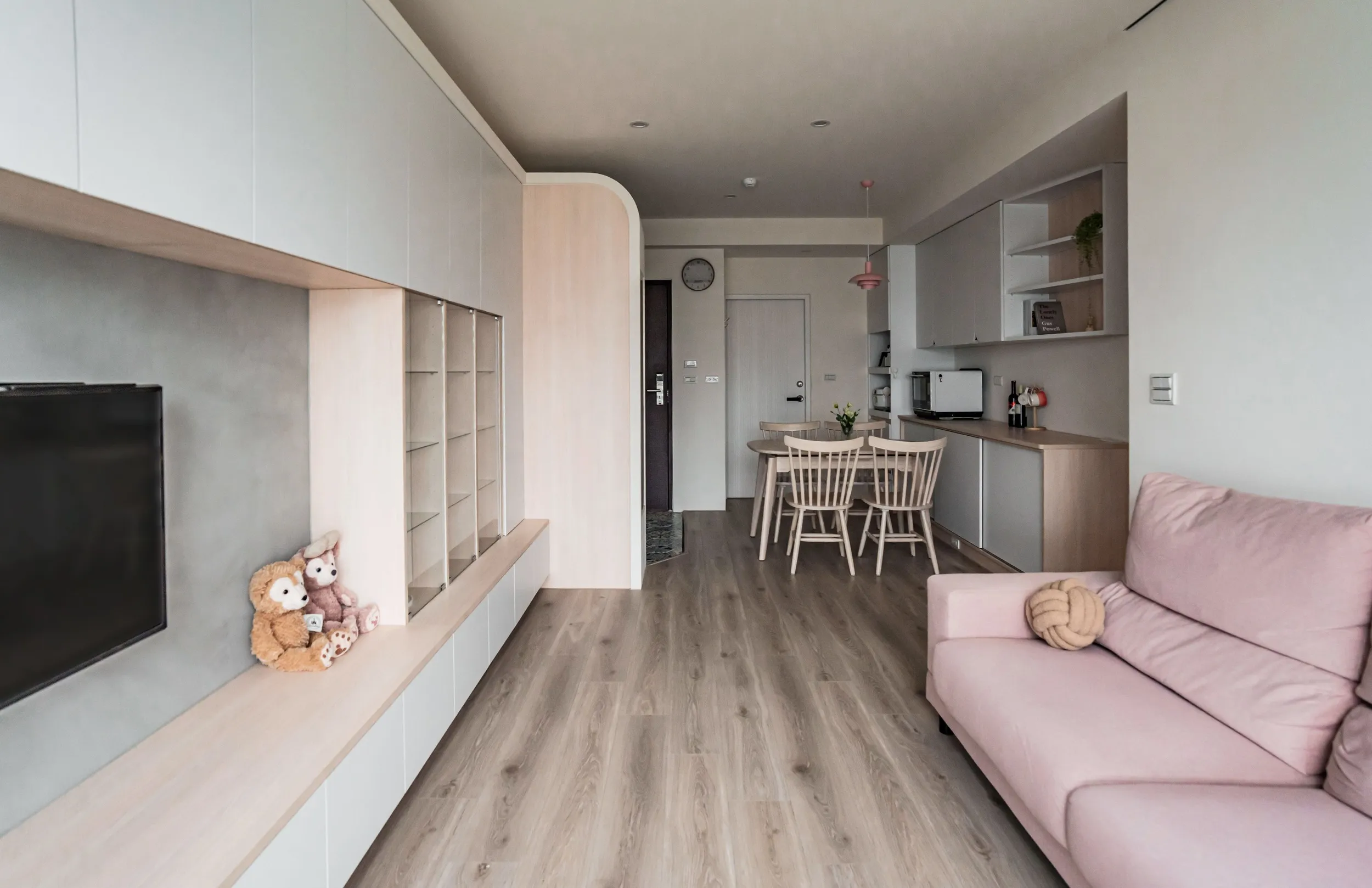 整體設計以純淨的白色與自然木色為主軸。公共空間的收納融合了木作可塑性與系統櫃模組化設計,實現了功能與美感的和諧一致。